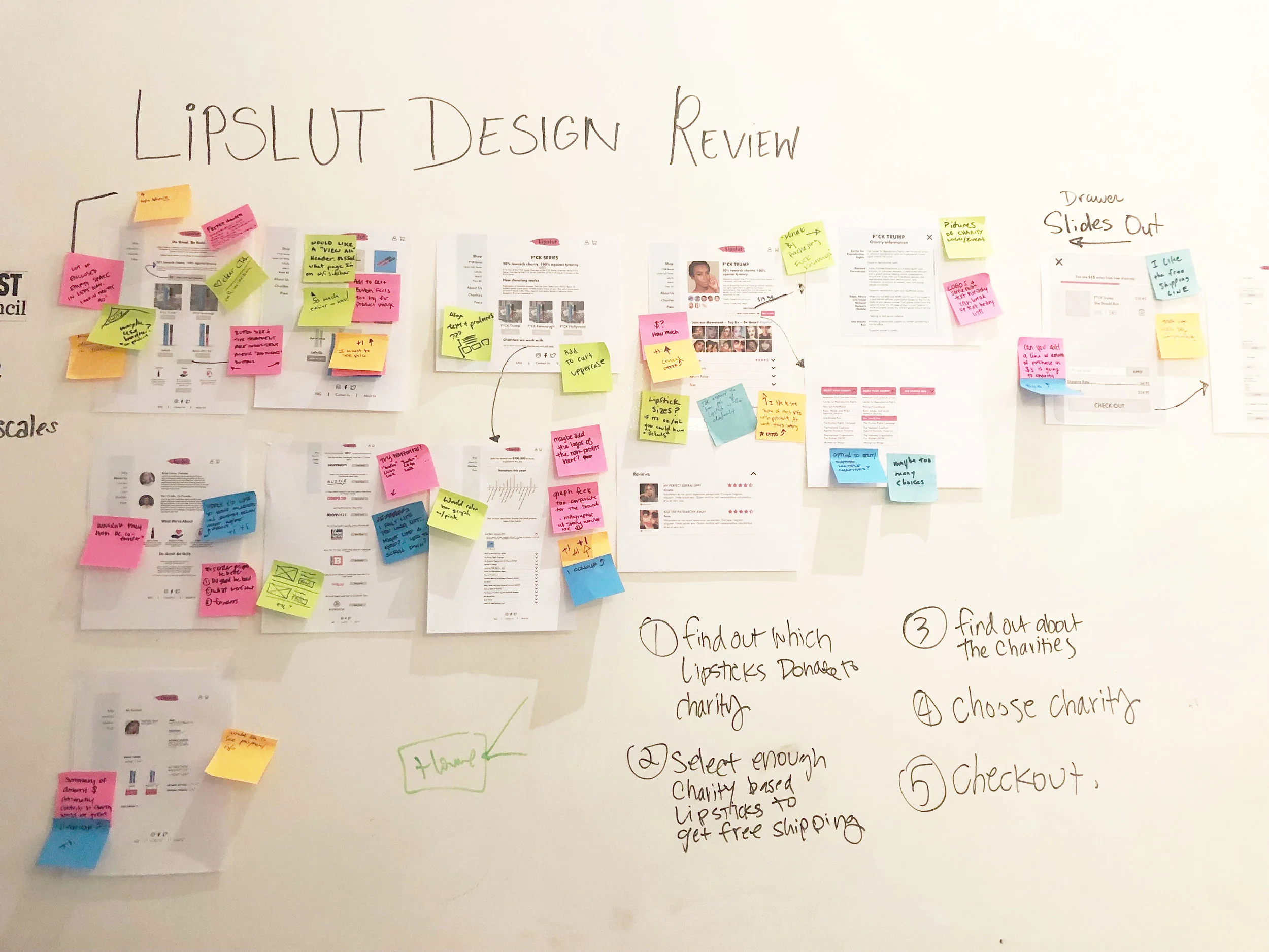 I conducted 7 user Interviews and 12 User Flow testing of Lipslut’s current site with women who are online shoppers, politically aware, and/or make-up enthusiast. Then synthesizing my findings into an Affinity Map, I gained key insights from our users and a greater problem with the Lipslut brand, which was inclusiveness.